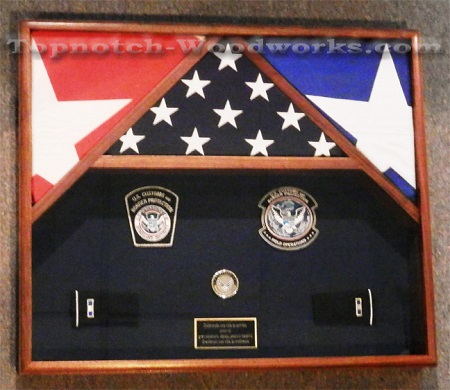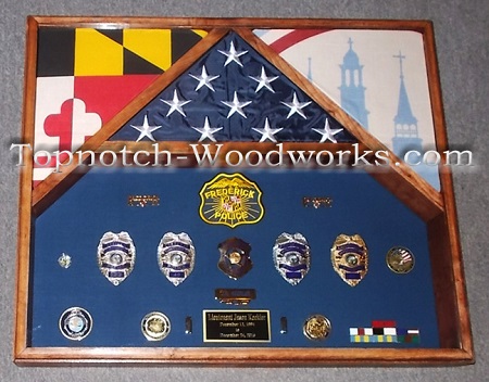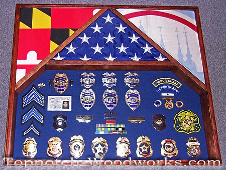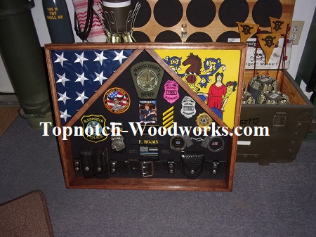 The Police / Law Enforcement Shadow Box from Topnotch Woodworks is the perfect shadow box to display any combination of Local Police, State Police or any other Law Enforcement agency's memorabilia with Unit/City/State flags and a USA flag!